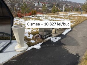 Trei coșuri de gunoi sprijinite de o bancă de beton cu picioare metalice au fost denumite „ansamblu”, fapt pentru care prețul de achiziție a sărit la 14.669 lei+TVA. Au fost cumpărate 66 de astfel de elemente cu o valoare totală 1.150.000 lei. Luate separat, găsim: ansamblu format din trei coșuri similare la prețuri 1.500 și 2.500 lei și bancă de beton cu 1.000 – 2.000 lei. Rezultă un preț umflat de cel puțin 3 – 4 ori.