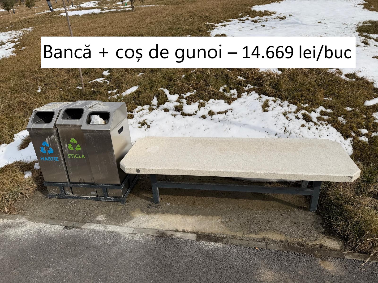 Trei coșuri de gunoi sprijinite de o bancă de beton cu picioare metalice au fost denumite „ansamblu”, fapt pentru care prețul de achiziție a sărit la 14.669 lei+TVA. Au fost cumpărate 66 de astfel de elemente cu o valoare totală 1.150.000 lei. Luate separat, găsim: ansamblu format din trei coșuri similare la prețuri 1.500 și 2.500 lei și bancă de beton cu 1.000 – 2.000 lei. Rezultă un preț umflat de cel puțin 3 – 4 ori.
