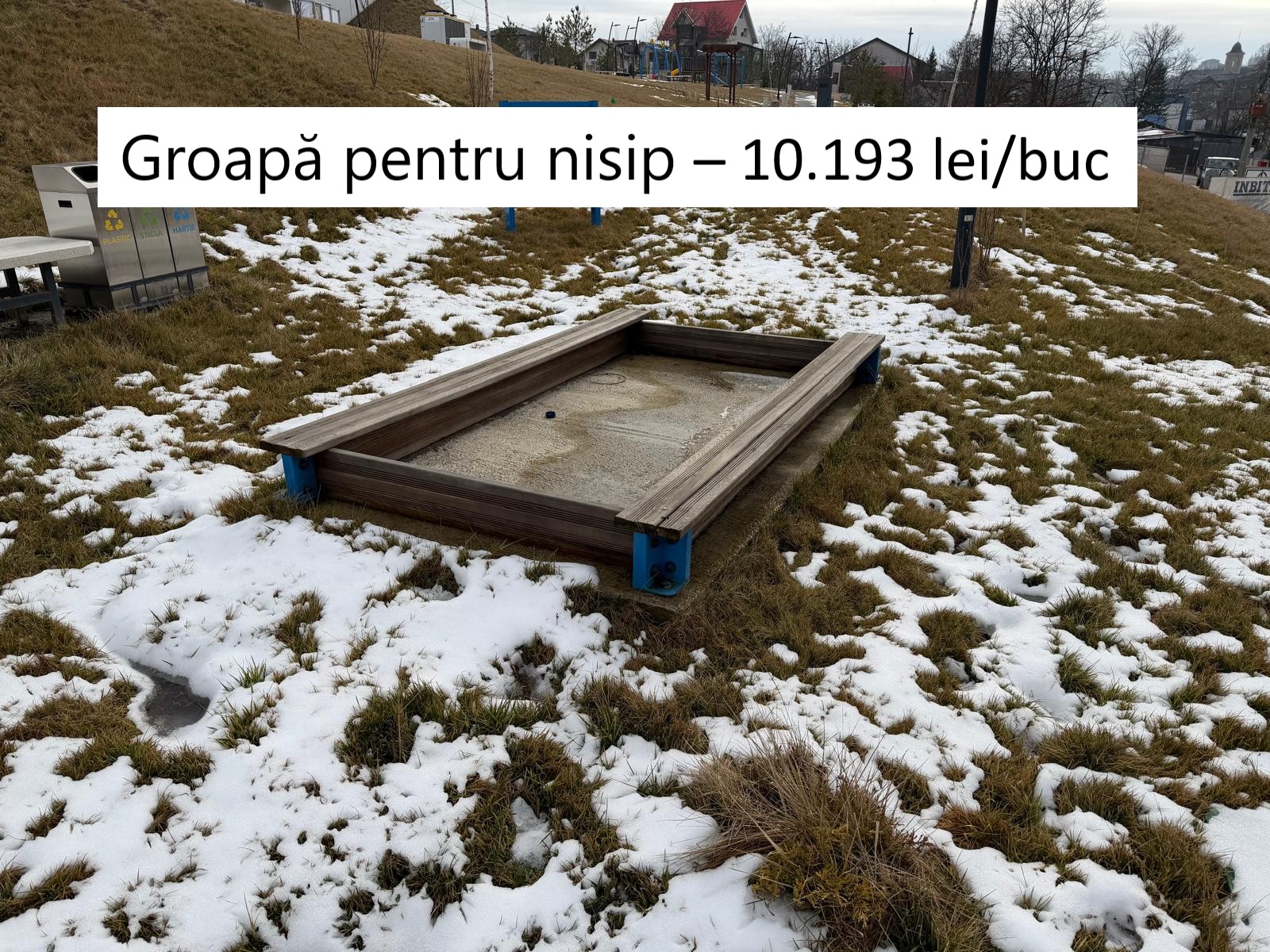 Groapa din imagine a costat peste 2.000 de euro+TVA, iar Primăria Iași nu a achiziționat una, ci două astfel de gropi, care ar urma să fie umplute cu nisip. Practic, din banii ieșenilor s-au plătit peste 25.000 de lei pentru câteva scânduri prinse în beton.