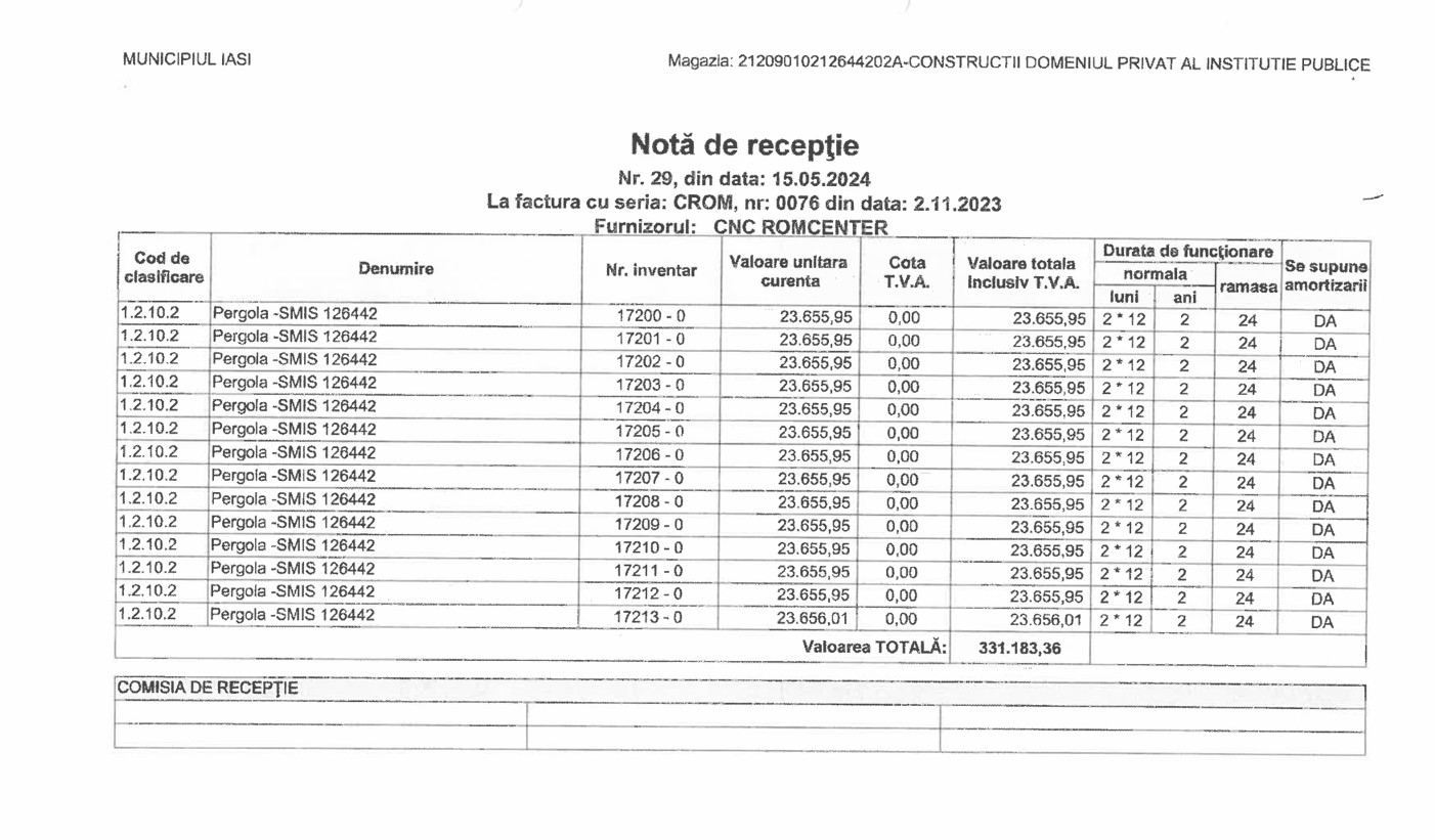 Conform procesului-verbal 64604 din 15 mai 2024, Primăria a recepționat 14 pergole la un preț de 23.656 lei+TVA și cu o valoare totală de 331.184 lei+TVA.