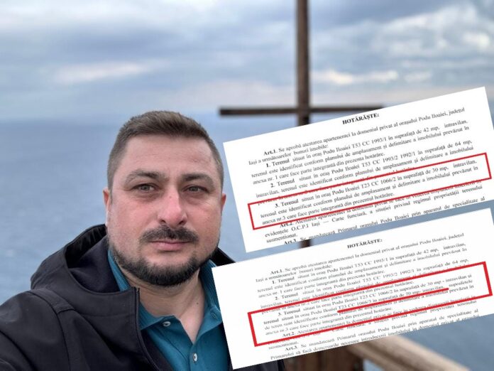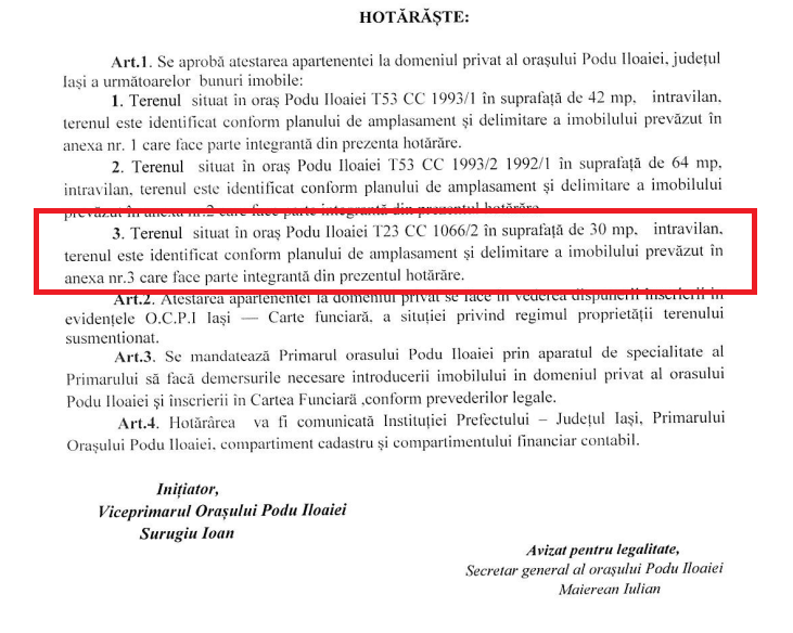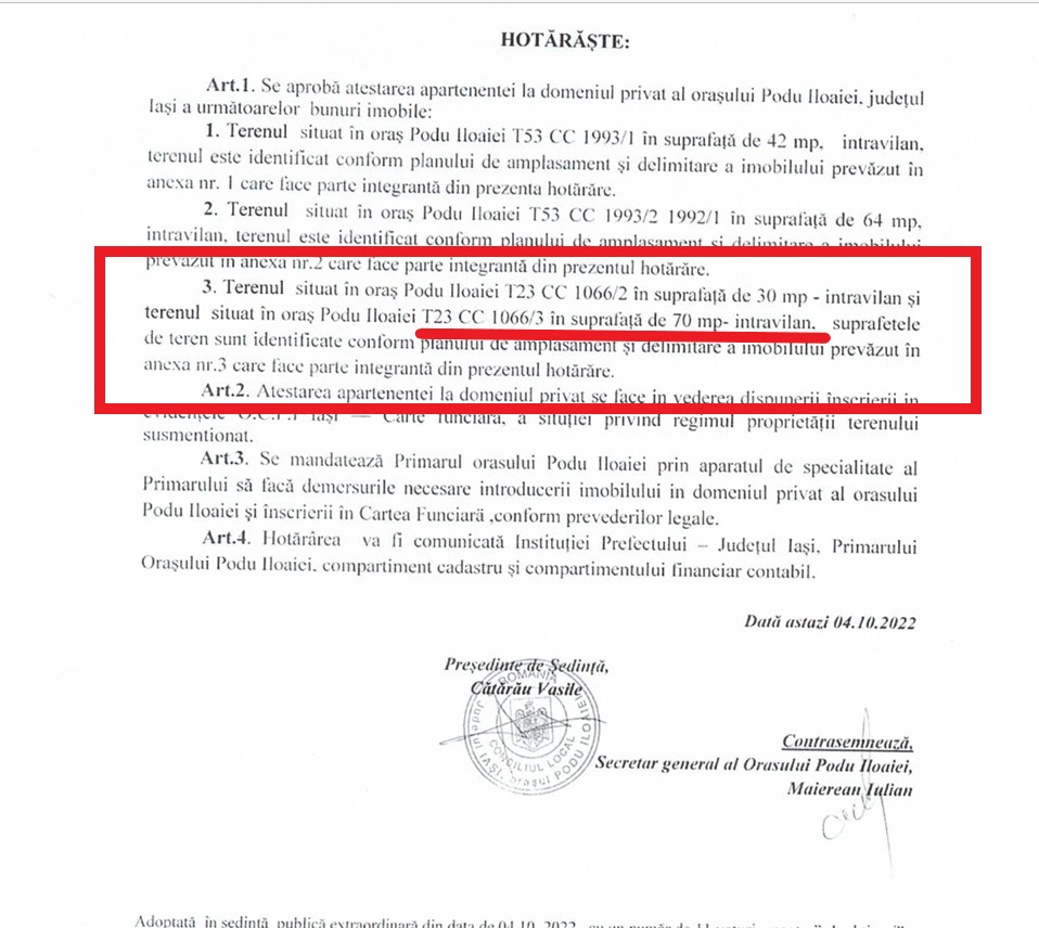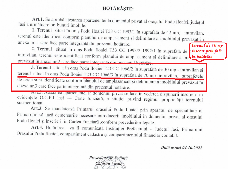 Pe 4 octombrie 2022, Consiliul Local Podu Iloaiei a fost convocat într-o ședință extraordinară. La punctul nr. 2 de pe ordinea de zi a fost introdus un proiect de hotărâre „privind atestarea unor bunuri imobile-teren la domeniul privat al orașului Podu Iloaiei”. Conform documentelor suport atașate convocatorului – proiect de hotărâre, referat de aprobare, raport de specialitate și referat al comisiei de speciale de inventariere (toate întocmite cu o zi înainte, pe 3 octombrie 2022) – era vorba despre  trei suprafețe de 42 mp (poziția 1 în proiectul de hotărâre), 67 mp (poziția 2) și 30 mp (poziția 3).