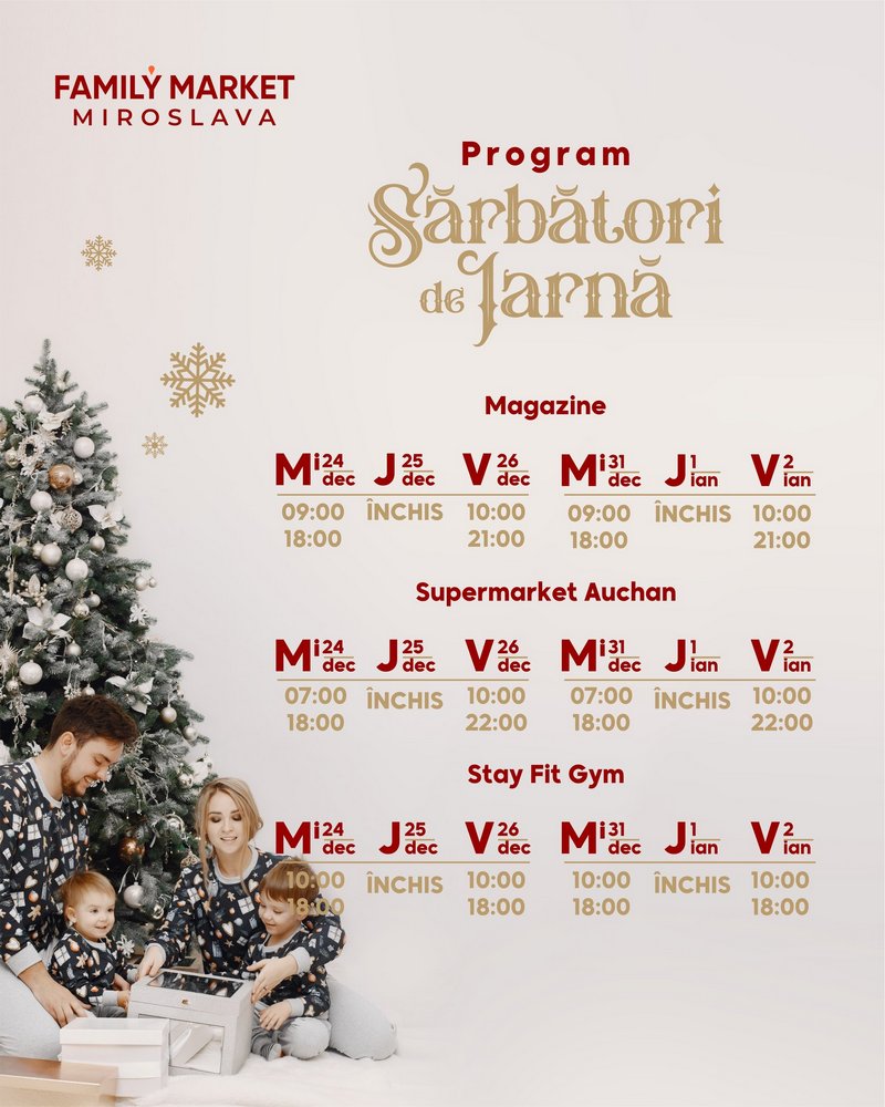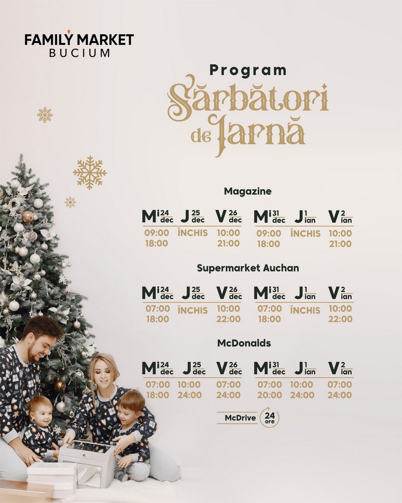 Și proiectele Family Market din Bucium și Miroslava vor funcționa după un program special de sărbători. Pe 24 decembrie și 31 decembrie, vei putea face ultimele cumpărături în intervalul 09.00 – 18.00. În prima zi de Crăciun și pe 1 ianuarie, magazinele vor fi închise, iar din a doua zi magazinele se vor deschide de la ora 10.00. Același program îl va avea și sala de fitness Stay Fit Gym din Family Market Miroslava. La Family Market Bucium, McDrive-ul va fi deschis non-stop.
