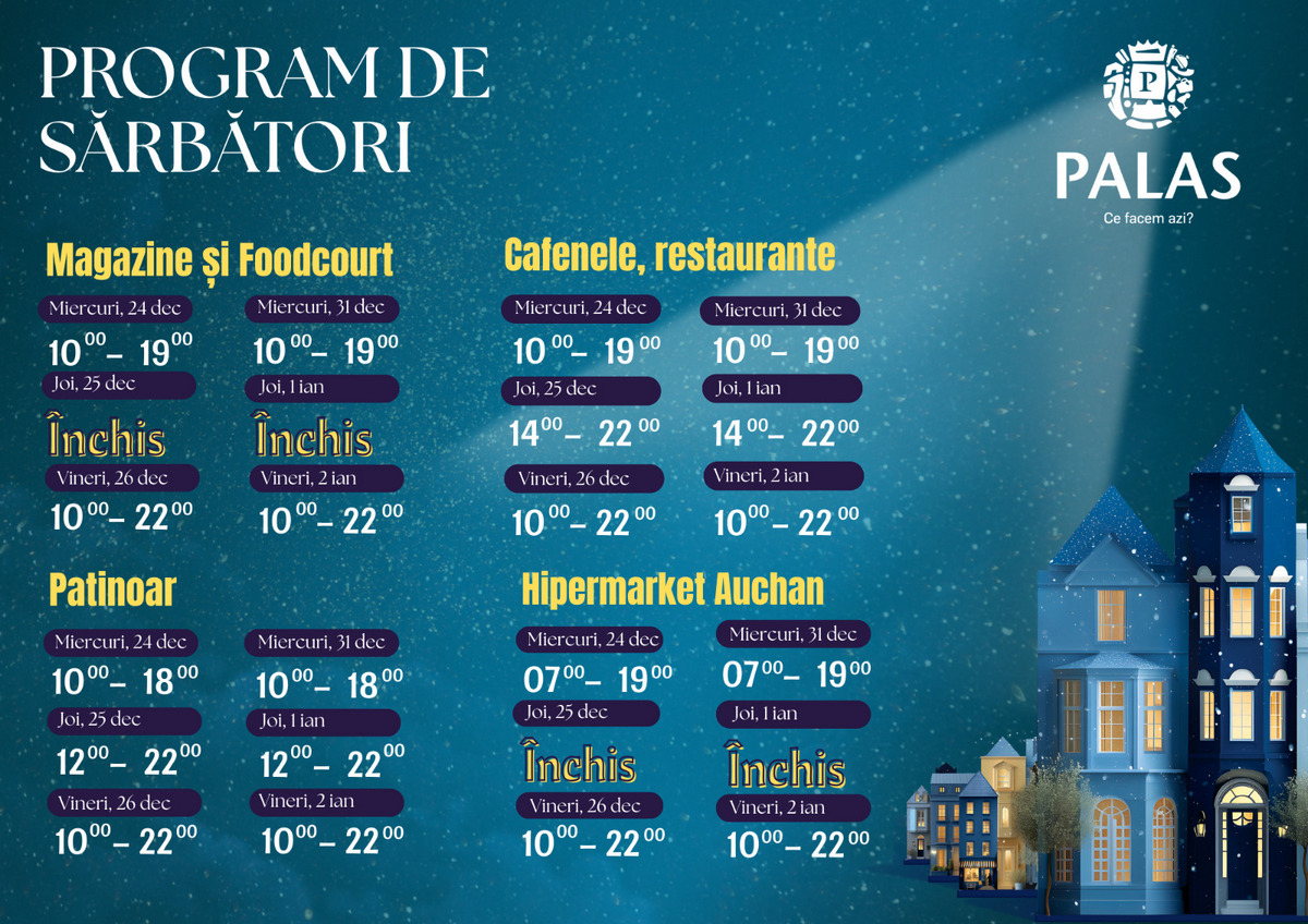 Palas va funcționa după un program special. Astfel, pe 24 și 31 decembrie, magazinele vor fi deschise în intervalul orar 10.00 – 19.00, iar hipermarketul Auchan va funcționa între orele 07.00 și 19.00. În prima zi de Crăciun și pe 1 ianuarie 2026, magazinele vor fi închise, urmând ca din 26 decembrie, respectiv 2 ianuarie, programul să revină la normal. Dacă dorești să ieși cu cei dragi în prima zi de Crăciun sau pe 1 ianuarie, trebuie să știi că patinoarul va fi deschis între orele 12.00 și 22.00. După o sesiune de distracție pe gheață, vă puteți relaxa la unul dintre restaurantele din Palas, deschise în intervalul 14.00 – 22.00. Programul complet poate fi consultat pe Facebook-ul Palas Iasi.
