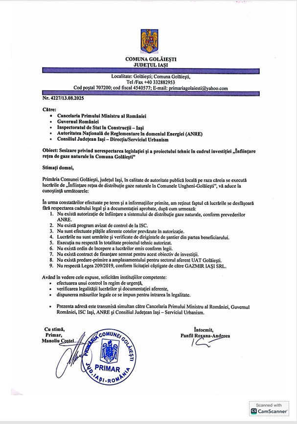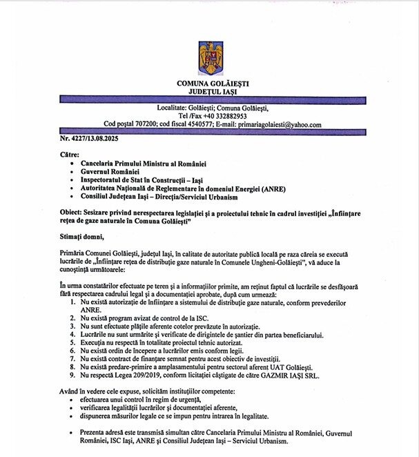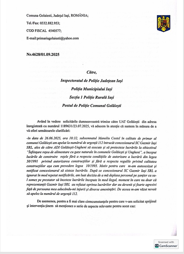 „În data de 26.06.2025, ora 10:32, subsemnatul Manoliu Costel în calitate de primar al comunei Golăiești, am apelat la numărul de urgență 112 întrucât concesionarul SC Gazmir Iaşi SRL, ales de către ADI Golăiești-Ungheni să execute și să proiecteze lucrările a început proiectul fără a respecta condițiile de autorizare a lucrării din legea 50/1991. Motiv pentru care m-am autosesizat și am notificat concesionarul să sisteze lucrările. După ce concesionarul S C a ignorat în mod repetat notificările, am luat decizia de a mă deplasa personal pe şantier ca să-l somez pe prestator să înceteze lucrările începute în mod ilegal, moment în care nu doar că reprezentanții Gazmir laşi SRL au refuzat oprirea lucrărilor, dar au devenit și foarte agresivi față de persoana mea, aducându-mi înjurii și diverse amenințări”, a susținut Manoliu în plângerea către IPJ.
