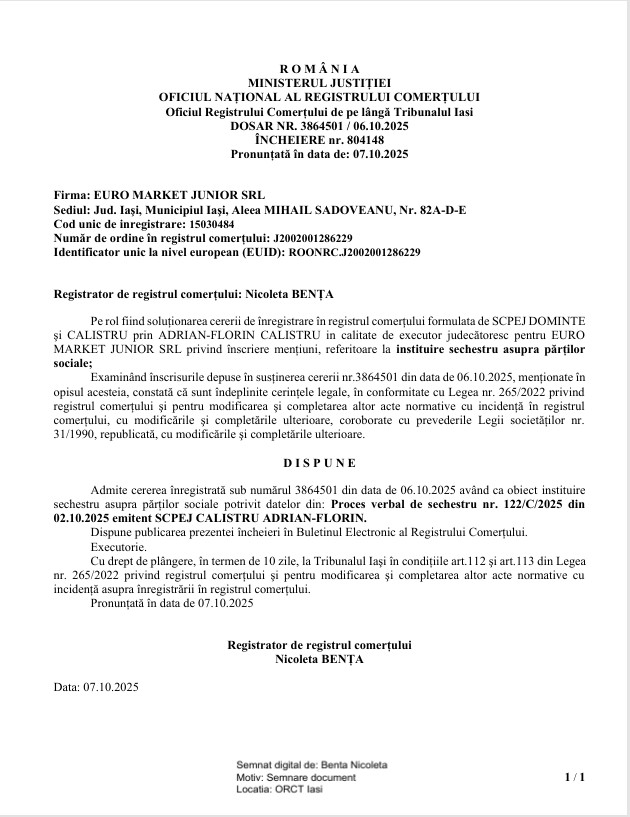 La începutul acestei luni, judecătorii ieșeni au admis cererea de instituire a unui sechestru asigurator asupra părților sociale pe care omul de afaceri Constantin Rădeanu le deține la firma Euro Market Junior SRL, societate din patrimoniul căreia fac parte terenul și clădirile complexului de evenimente „La Castel” din dealul Copoului. Instituirea sechestrului fost consemnată și de către Registrul Comerțului, informațiile devenind astfel publice. Cererea de instituire a sechestrului a fost depusă prin intermediul avocatului Bogdan Volovăț, care îl reprezintă pe omul de afaceri Florin Onofrei într-un proces deschis de către acesta încă din anul 2023 în încercarea de recuperare a unui împrumut de 100.000 de euro pe care i l-ar fi acordat lui Rădeanu. Acesta din urmă nu a recunoscut debitul, nu a achitat suma, ceea ce a dus la un conflict juridic.