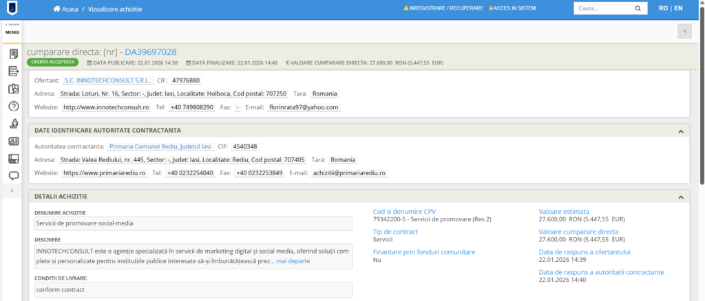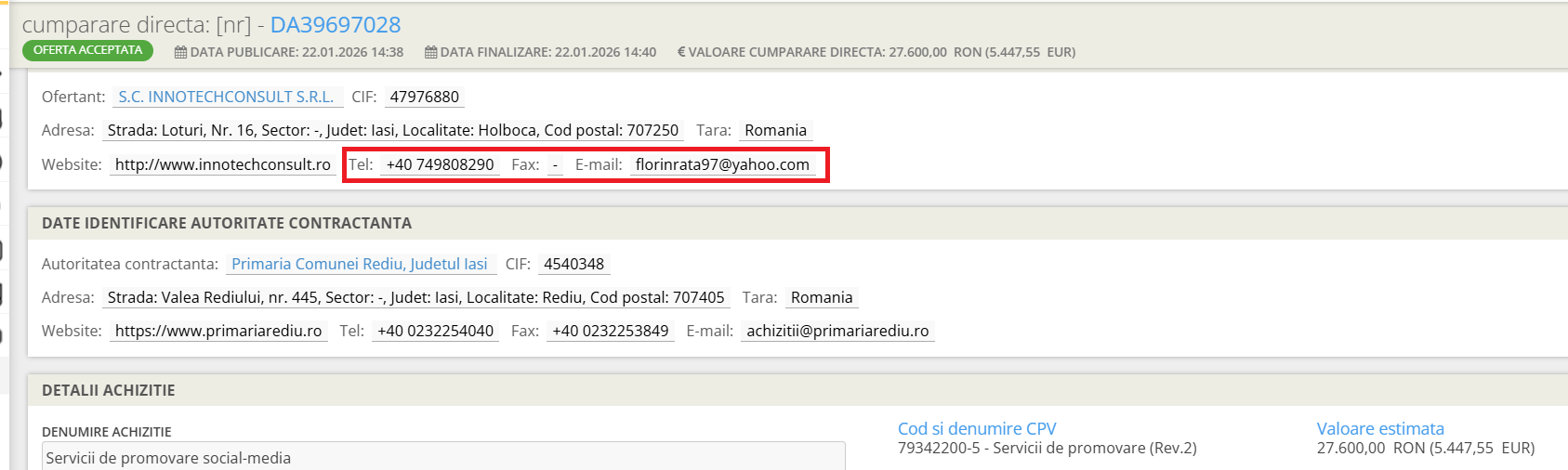 Cu Primăria Rediu, unde primar este Cristinel Condrea, firma Innotechconsult SRL a încheiat pe 22 ianuarie un contract în valoare de 27.600 lei, sumă fără TVA, (circa 5.500 euro) pentru promovarea imaginii comunei pe rețele sociale.