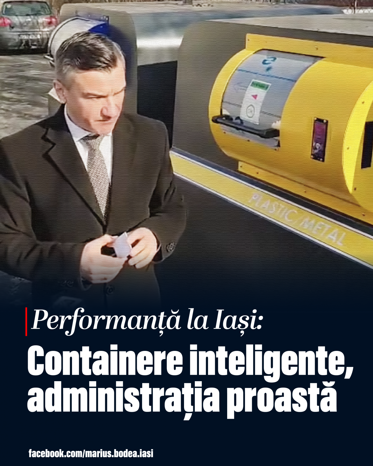 Primăria Iași anunță cu entuziasm introducerea unor așa-numite „containere inteligente” pentru deșeuri, în care gunoiul poate fi aruncat pe baza de cartelă și aplicație mobilă. Sunt prezentate ca o „revoluție” în salubritatea orașului.