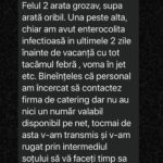 „Felul doi arată grozav, supa arată oribil. Una peste alta, chiar am avut enterocolită infecțioasă în ultimele două zile înainte de vacanță, cu tot tacâmul: febră, vomă în jet etc. Bineînțeles că personal am încercat să contactez firma de catering, dar nu au nici un număr valabil disponibil pe net. Tocmai de asta v-am transmis și v-am rugat să vă faceți timp să puneți zilnic poze cu meniul să vedem și noi ce plătim”.