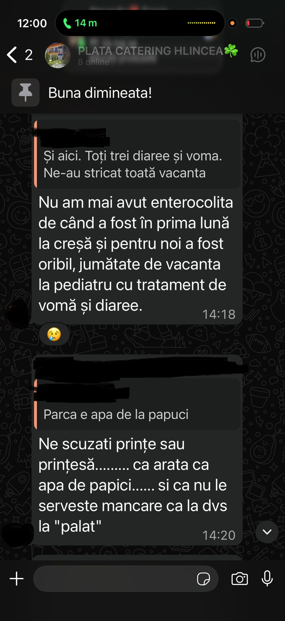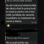 Iată mai jos o serie de discuții de pe grupul de WhatsApp cu cateringul în școală, unde mai mulți părinți acuză faptul că micuții lor s-au îmbolnăvit după ce ar fi consumat alimentele aduse de firma Ionis Mire SRL.