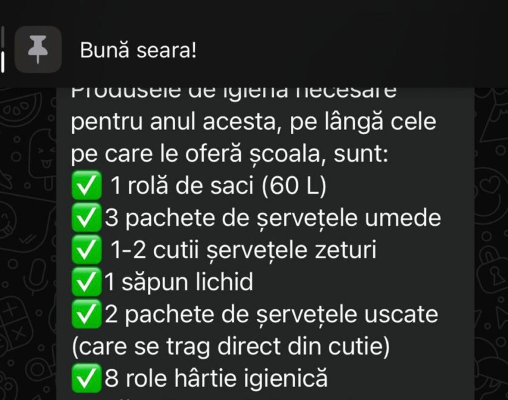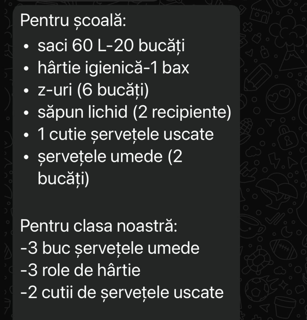 Deși școala trebuie să asigure consumabilele din clădire, părinții arată că tot ei sunt nevoiți să cumpere lunar chiar și produsele de igienă la băi.