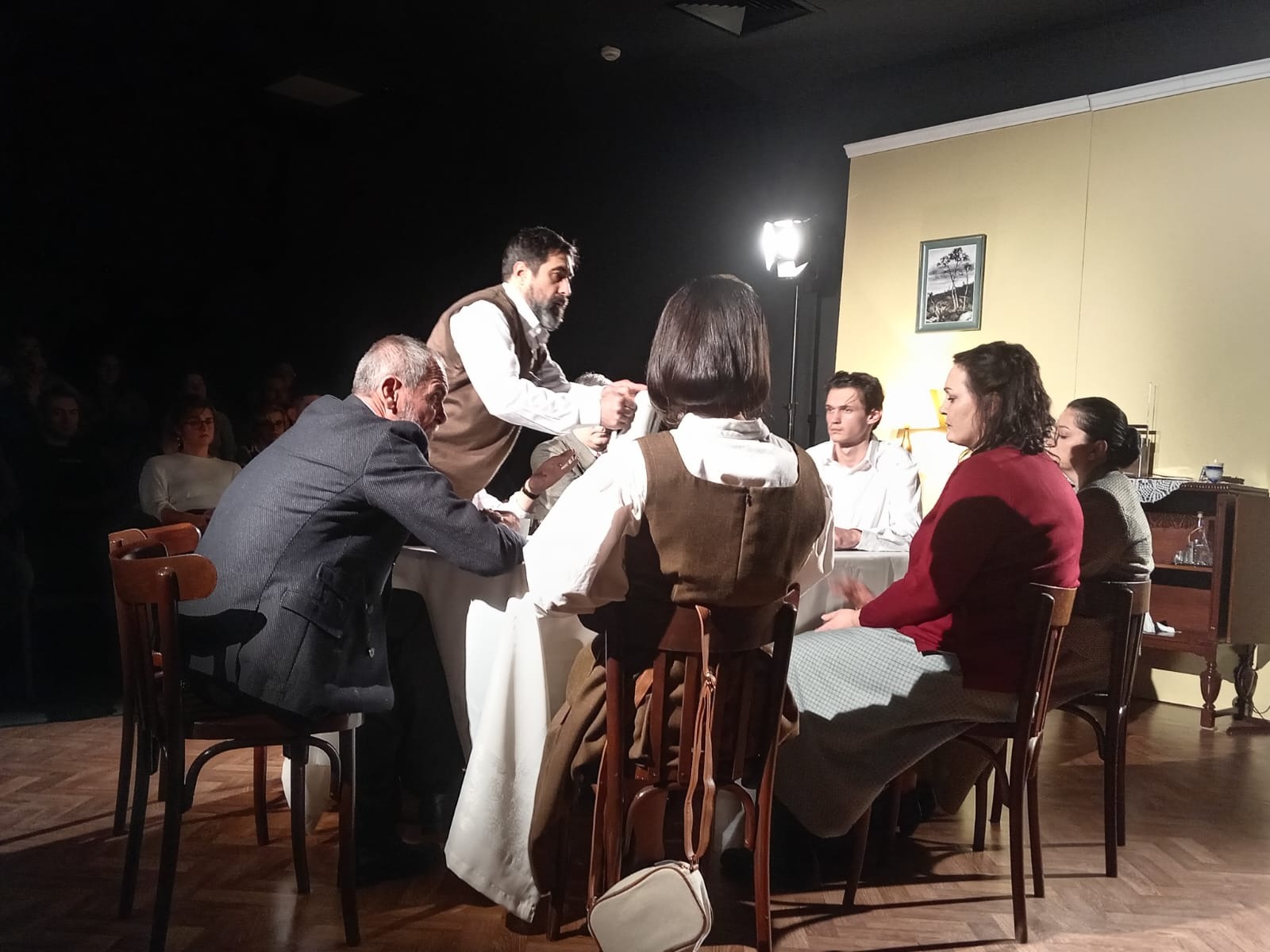 Discretă, scenografia semnată de aceeași Ella Nistor se rezumă la câteva obiecte cu forță evocatoare (mobilier de altădată, un radio-casetofon, un telefon de demult, un macrame sau un clondir făcut probabil la fabrica de sticlă din Dorohoi) și costume cu o anume patină retro. Fără a crea o ruptură între trecut și prezent, decorul funcționează mai degrabă ca o punte pe care suntem invitați să circulăm între repere temporale: 1981 – anii 2000, 1981 – prezent etc. În mod inteligent, alături de distribuția oficială, mai există un personaj invitat în scenă: istoria însăși, ilustrată în special prin proiecții video sau prin imagini cu marii anti-eroi precum Antonescu, Dej, Ceaușescu. Comentariul constant al performerilor acompaniază coborârea aceasta deloc confortabilă în peisagistici umane pe care încă le simțim atât de familiare. Un anumit tip de energie se creează încă din prima jumătate de o oră, o formă de stupefacție cu care publicul botoșănean asistă și își asumă întâmplările scenice. Subiectul nu pare deloc închis, unele personaje reale încă trăiesc și, probabil, știu că la teatru li s-au redeschis dosarele, la fel cum noi știm că ei știu asta.