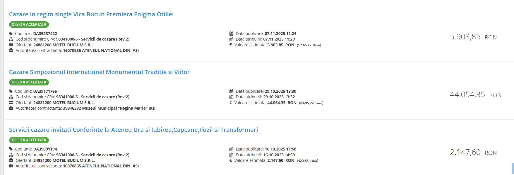 Firma Motel Bucium SRL a încheiat contracte cu două instituții subordonate Consiliului Local, Ateneul Național din Iași și Muzeul Municipal „Regina Maria”. În data de 29 octombrie 2025 , Muzeul Municipal încheie un contract cu Motel Bucium SRL pentru servicii de cazare în cadrul „Simpozionului Internațional Monumentul Tradiție și Viitor”, servicii oferite de Hotelul Traian. Valoarea contractului a fost de 44.054 lei fără TVA (peste 8.000 euro) și a vizat cazarea participanților la simpozion în regim single și dublu. Simpozionul a avut loc pe 30 octombrie 2025 la Palatul Culturii.